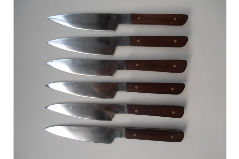 J’utilise principalement des aciers Fe-C hypereutectoïdes procurant aux lames une dureté supérieure aux aciers inoxydables ~ 62 HRC. Tous les aciers travaillés ont une teneur en carbone autour de wt%~1. Les couteaux en acier carbone nécessitent un entretien régulier afin d’éviter qu'ils ne rouillent.